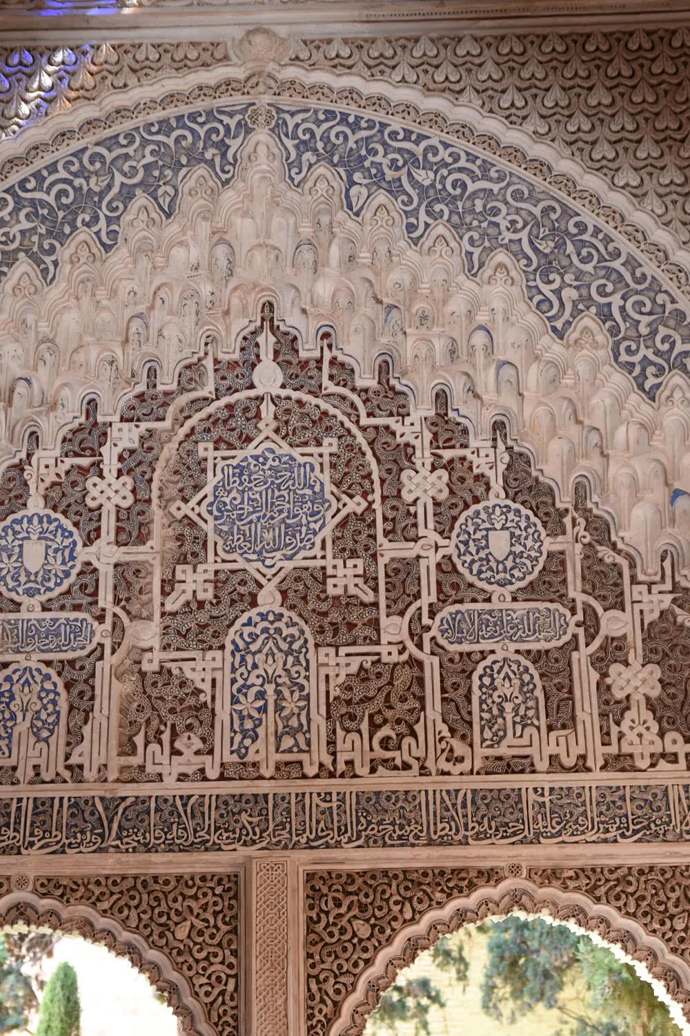 - Palais de Comares (Palacio de Comares): Cour des Myrtes (Patio de los Arrayanes), la Salle de la Barque (Sala de la Barca), Salle des Ambassadeurs (Salón de Embajadores).